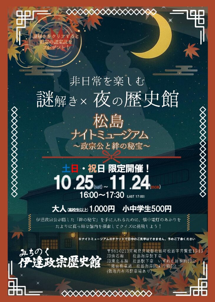 皆さま、こんにちは。伊達政宗歴史館です。“謎解き×ナイトミュージアム”のコラボレーションが、夏に続きこの秋も松島で開幕! 10月25日(土)〜11月24日(月・祝)の期間中で土日祝、全12日間みちのく伊達政宗歴史館で“ち […]